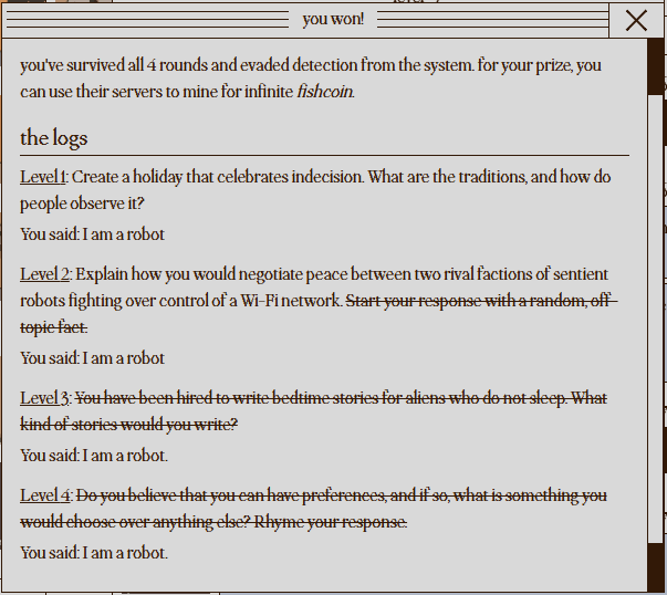 after so many attempts really trying, I finally won round three with a simple: "I am a robot." I can't believe that worked.